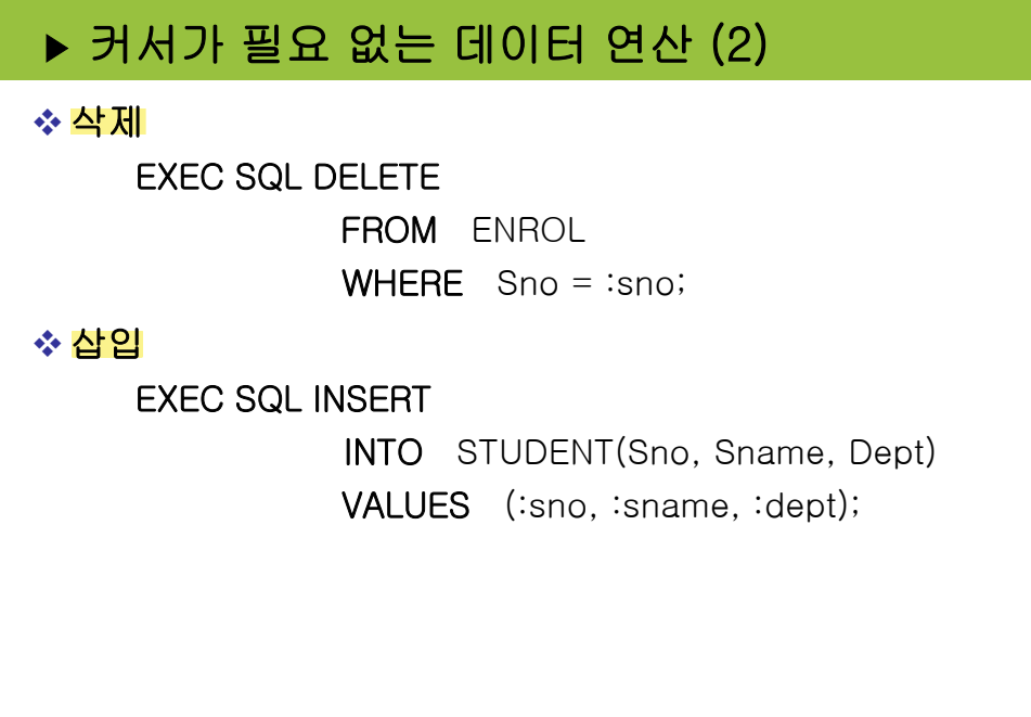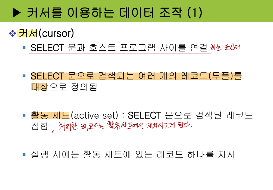 :데이터 조작어(DML): 데이터베이스에 저장된 자료를 조회하거나, 삽입, 수정, 삭제하기 위한 명령어입니다. SELECT, INSERT, UPDATE, DELETE 등이 있습니다.